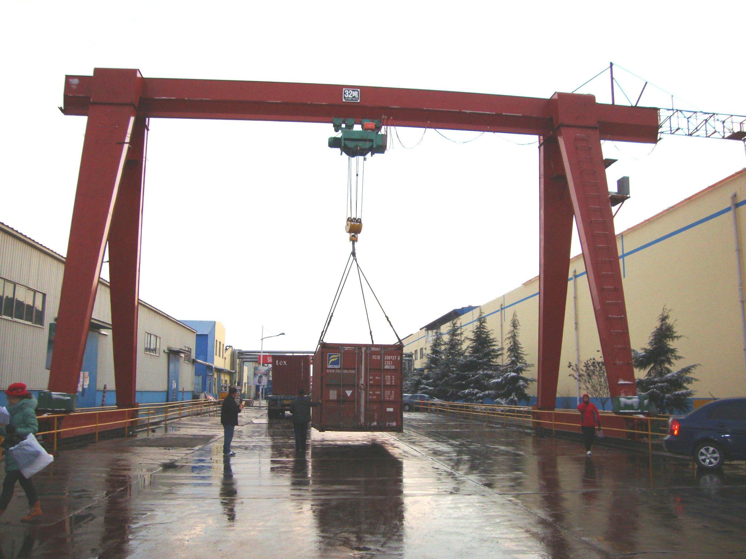 門式起重機是橋式起重機的一種變形,又叫龍門吊。主要用于室外的貨場、料場貨、散貨的裝卸作業(yè)。門式起重機具有場地利用率高、作業(yè)范圍大、適應面廣、通用性強等特點,在港口貨場得到廣泛使用