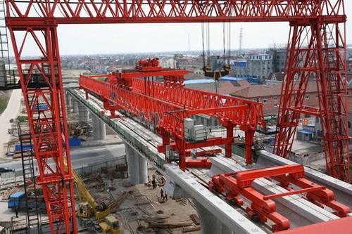 架橋機**是將預(yù)制好的梁片放置到預(yù)制好的橋墩上去的設(shè)備。架橋機屬于起重機范疇,因為其主要功能是將梁片提起,然后運送到位置后放下。但其與一般意義上的起重機有很大的不同。其要求的條件苛刻,并且存在梁片上走行,或者叫縱移。架橋機是一種運行工作范圍廣、性能優(yōu)良、操作方便、結(jié)構(gòu)安全的鋼結(jié)構(gòu)軌道式預(yù)制梁吊裝架設(shè)設(shè)備。