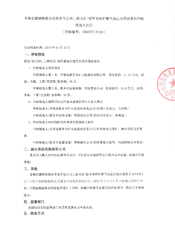 移動版:首鋼京唐鋼鐵聯(lián)合有限責(zé)任公司二期項(xiàng)目-能環(huán)部高爐煤氣加壓站用起重機(jī)中標(biāo)候選人公示