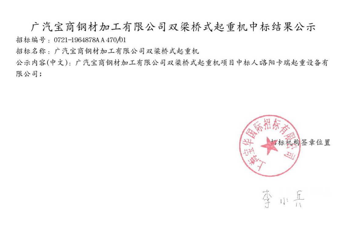 廣汽寶商鋼材加工有限公司雙梁橋式起重機中標結果公示