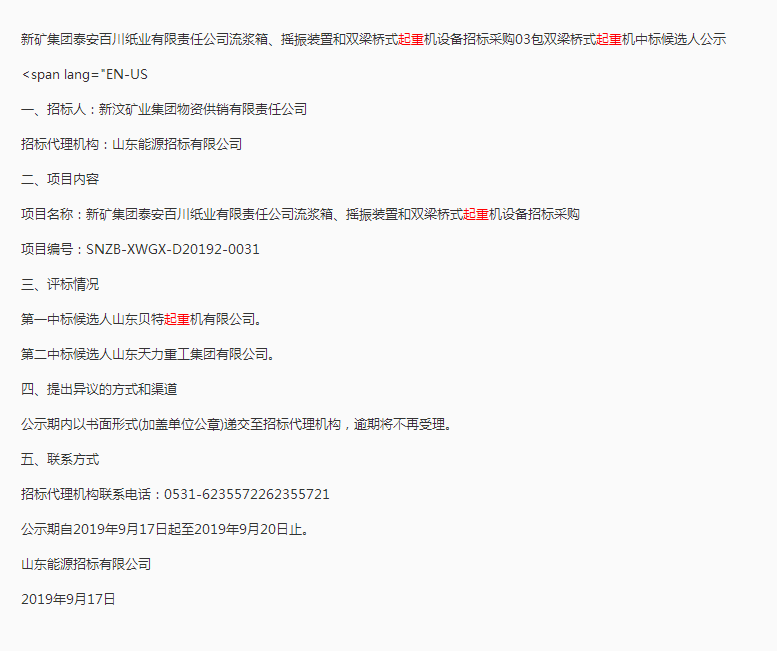 移動版:【新礦集團(tuán)泰安百川紙業(yè)有限責(zé)任公司流漿箱、搖振裝置和雙梁橋式起重機(jī)設(shè)備招標(biāo)采購】中標(biāo)候選人公示