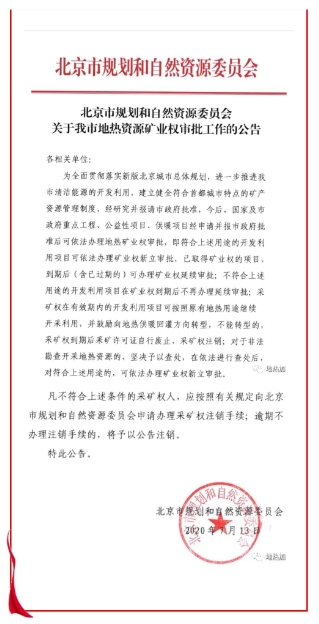 為進一步推進北京市清潔能源的開發(fā)利用,建立健全符合首都城市特點的礦產(chǎn)資源管理制度,7月14日,北京市規(guī)劃和自然資源委員會官網(wǎng)發(fā)布了《北京市規(guī)劃和自然資源委員會關于我市地熱資源礦業(yè)權審批工作的公告》通知。