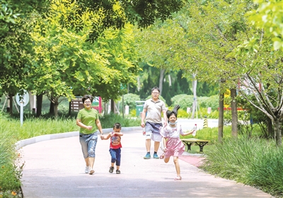 市民在綠意盎然的官港森林公園中休閑散步。