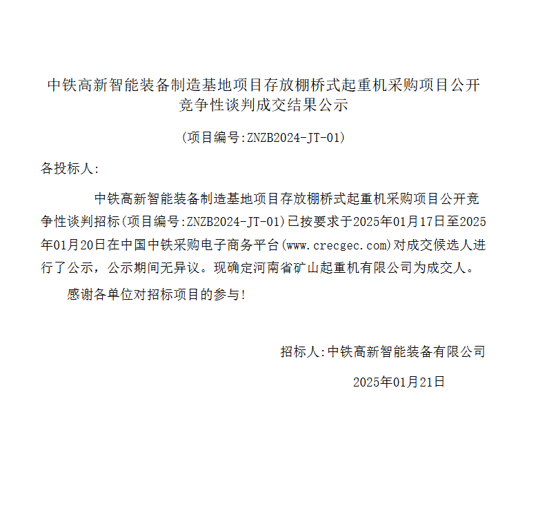 移動(dòng)版:中鐵高新智能裝備制造基地項(xiàng)目存放棚橋式起重機(jī)采購(gòu)項(xiàng)目公開(kāi)競(jìng)爭(zhēng)性談判成交結(jié)果公示