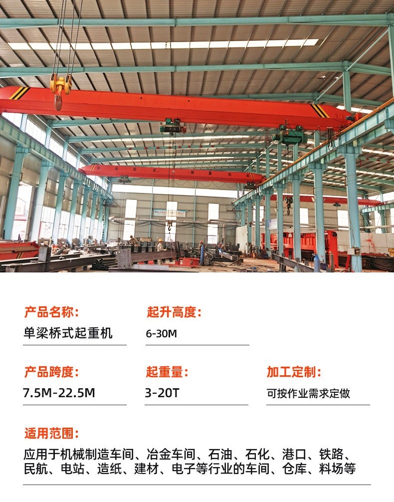 公司主要產(chǎn)品有單梁起重機、雙梁起重機、橋式起重機、門式起重機、變頻起重機、抓斗、防爆起重機、旋臂起重機、電動葫蘆及起重機配件等。產(chǎn)品廣泛應用于港口、碼頭、機械、冶金、礦山、電力、鐵路、水利、汽車、造紙、化工等行業(yè)。公司完善的質量保證體系、嚴格的管理機制,強大的生產(chǎn)能力,先進的檢測手段,及時的售后服務,深得國內(nèi)外用戶信賴。